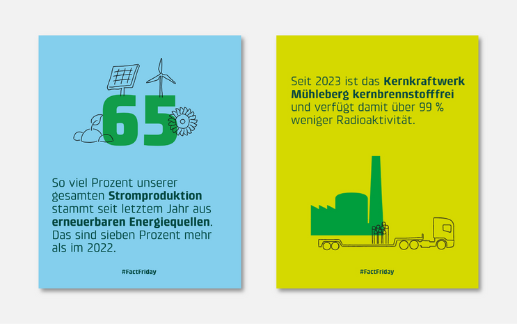Zur Aufbereitung von Fakten aus dem Nachhaltigkeitsbericht der BKW habe ich verschiedene Grafiken gestaltet, die gezielt für Social Media produziert wurden. Durch den Fokus auf auffällige Zahlen, wie die Produktion erneuerbarer Energien oder den Abbau im Kernkraftwerk Mühleberg, werden die wichtigsten Themen auf ansprechende und schnell erfassbare Weise kommuniziert.